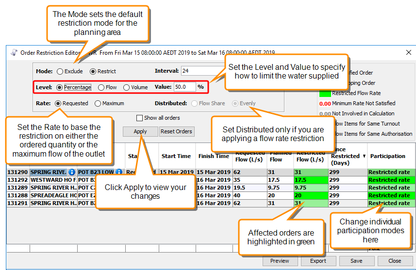 - Flow - specify the total flow available during the restriction period. This will be shared out based on the settings you choose for the Distributed field and the Rate field.