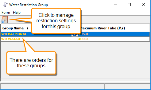 Water Restriction Group button on the Planning Schematic toolbar to open the Water Restriction Group screen. Groups that include orders that have not yet been restricted (or for which the restrictions have been removed) are shown in yellow text.