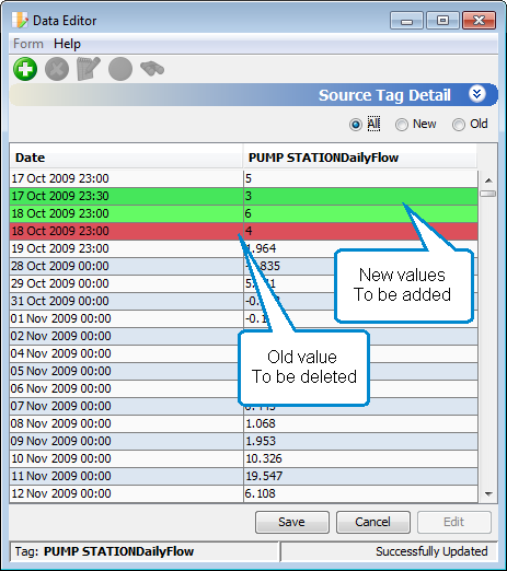 In Edit mode, new values are highlighted in green.