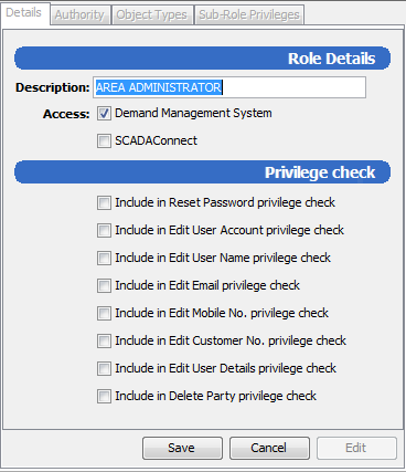 - Select the privileges that you want to check. If a privilege is not enabled, sub-role privileges are not checked when another user is making changes to the party details of a user with this role.