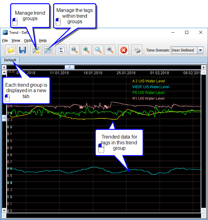 You can trend tag data from other parts of the application. For example, trend data for a single tag from the Site Tags Module, or trend a tag group from the Tag Groups Module. Opening the trending tool from these modules can be more efficient, as the application does not have to load all tags.