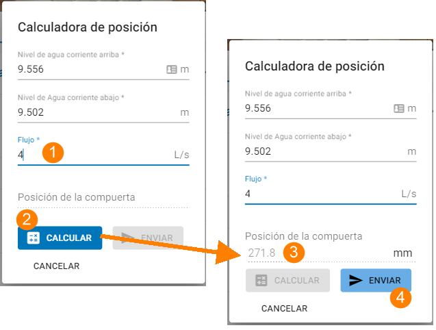 La calculadora no cambia el caudal o la posición de la compuerta, solo calcula las configuraciones necesarias para una posición o caudal determinado. Luego de haber completado el cálculo, puede elegir si aplicar o no el nuevo valor.
