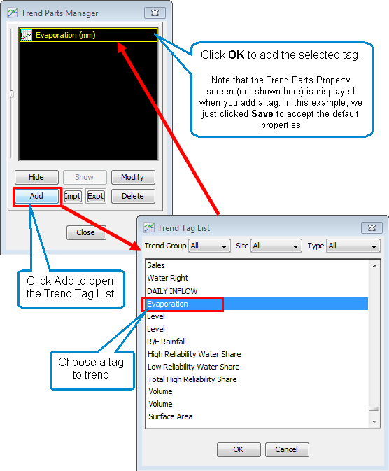 Trend Detail to open the Trend Parts Manager. - Click Add to add a new tag to the trend group. The Trend Parts Manager loads a list of available tags.