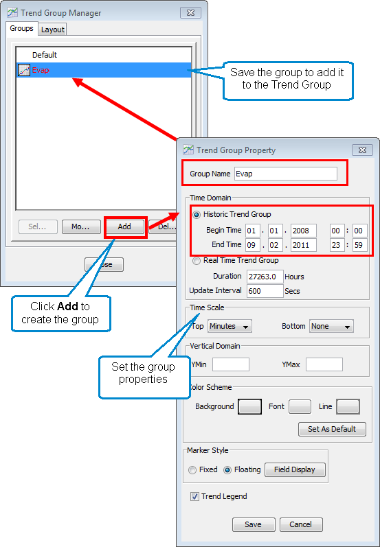 - In the Trend Group Manager, click Add to create a new Trend Group. The Trend Group Properties screen opens