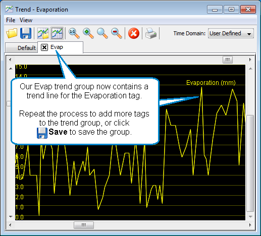 In the example, we have added an Evaporation tag to the trend group and accepted the default trend line properties: