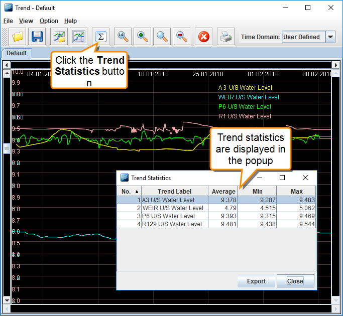 You can view statistics calculated for the trends displayed in a trend group. Trend statistics can be exported to a spreadsheet file.