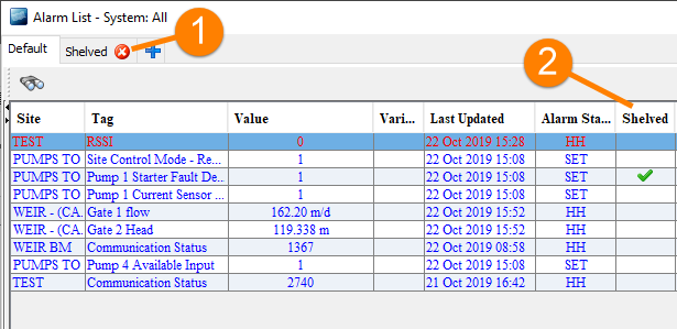 By default, shelved alarms are filtered out of the default tab on the Alarm List (but you can adjust the filters if you choose). When you display all alarms, shelved alarms are indicated by a tick in the Shelved column. The Alarm List also includes a tab that is filtered to show only shelved alarms