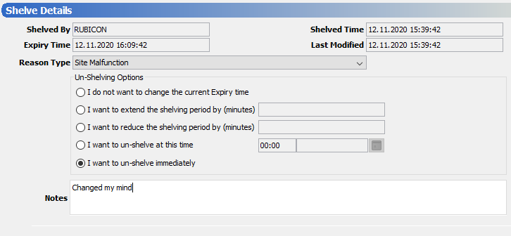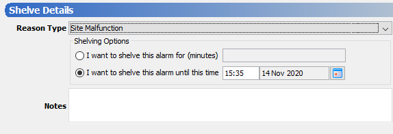Note that if you extend a shelving period, the maximum time limit is still calculated from the time when you first shelved the alarms. For example, if you set the period to the maximum allowed, you cannot later extend the period. If you need to extend the period, unshelve and reshelve the alarms.