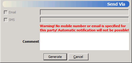If the user does not have an email address or a mobile phone number, the form includes a warning in the Send Via section: