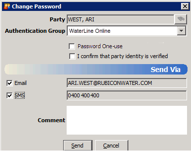 - If the user has an email address or mobile phone number, click Sendto generate a password and send it directly to the user. They will receive an email stating, for example, "New <authentication group> password for <user>: AeNTi4186" but the password will not be displayed to you.