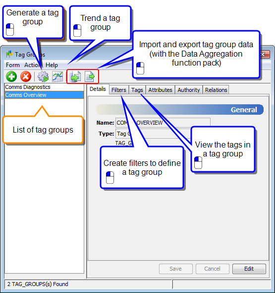 Tag groups are used for use in reporting and trending. They can also be used for selecting tags for data import and export purposes.