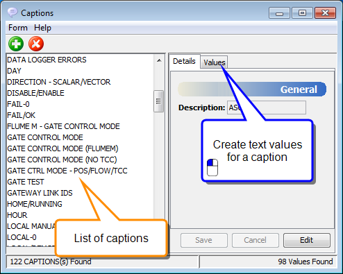 A caption is a set of text values for a tag that can be displayed in the application. The caption contains the mappings from the underlying numerical values stored in the tag, to the text values displayed on screens and forms.