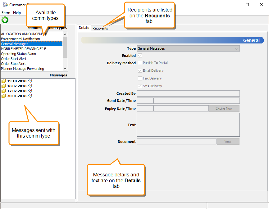 The Customer Comms module is where you can send communications to customers, and view a record of any messages sent. Messages use the custom message templates that you have defined in the Comm Types module.