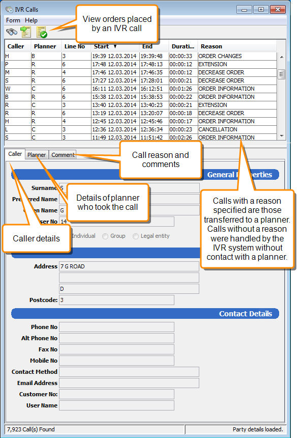 The IVR calls module stores a record of all IVR calls received that resulted in an order being placed, a call being transferred to a planner, or a message being left. You can use the IVR calls module to track orders placed via IVR calls and to track calls transferred to planners.