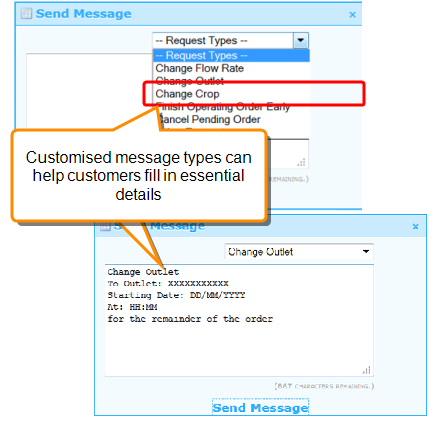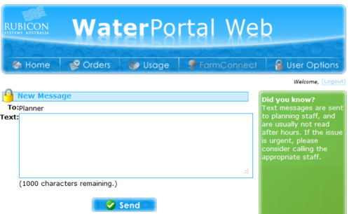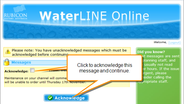 Customers receive messages that have been sent to them by irrigation staff as soon as they log in and they must acknowledge any messages before they proceed.