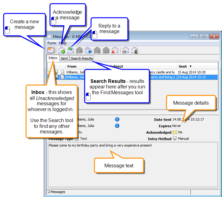 Messages can be sent to objects and orders. These may be used as free text notes, or sent to relevant staff.