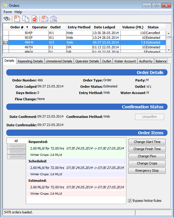 An order is a request for water to be supplied to specific outlet, for a specific customer via your water network. An order may consist of one or more order items, each with a different flow rate. In a single order, the items run consecutively with no gaps.