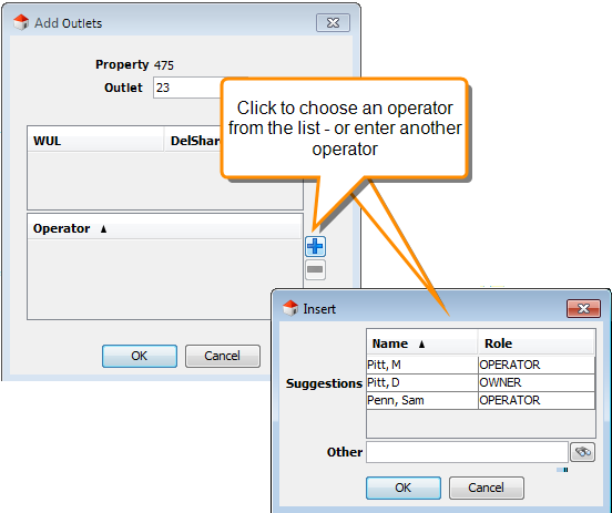 Find tool to search for outlets. - Click Add beside the Outlet Operator panel to add an operator for the outlet. The Insert window suggests any likely options, such as the property owner, or you can use the